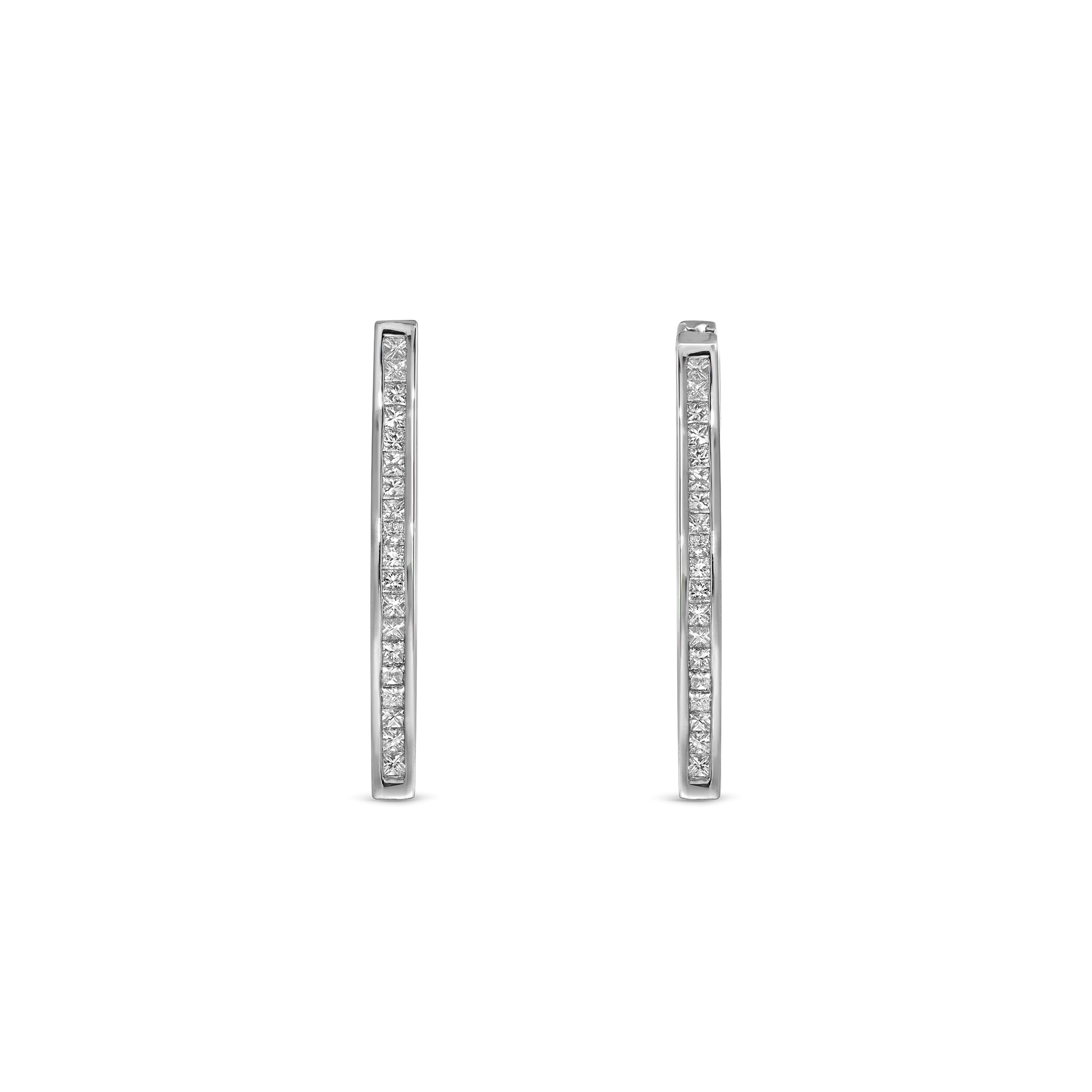 Modern minimalism meets timeless brilliance. These sleek diamond bar studs feature a precise line of princess-cut diamonds, channel-set in polished 14K white gold. Their architectural silhouette catches the light from every angle, creating an understated yet radiant statement. Perfect for stacking or worn as a refined everyday signature.