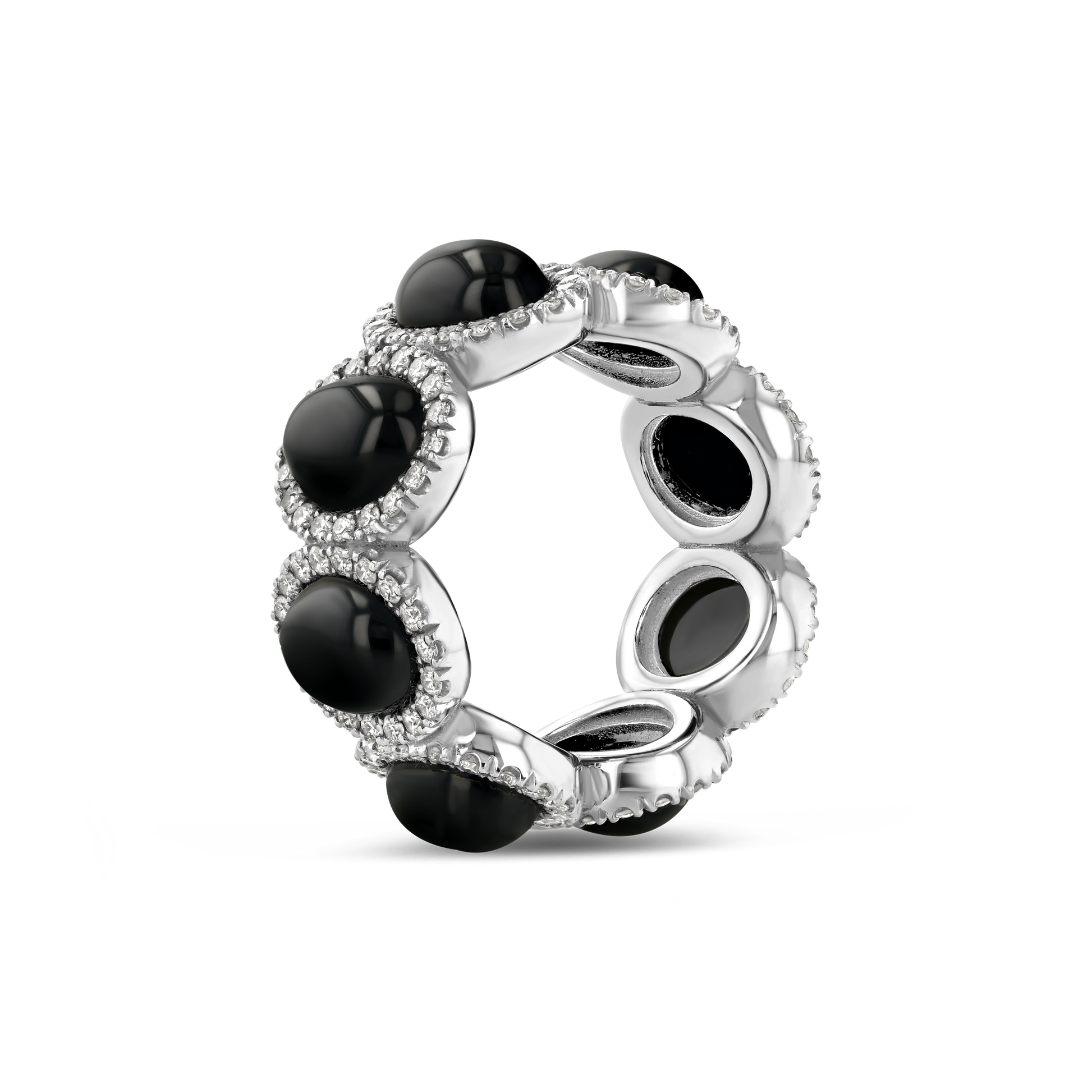 A study in contrast and strength, this striking eternity-style band features smooth cabochon-cut black onyx framed by halos of pavé-set round diamonds. The sculptural 18K gold design captures light and shadow in perfect balance — an ode to modern elegance and refined power. Worn solo or stacked, it commands presence with quiet confidence.
